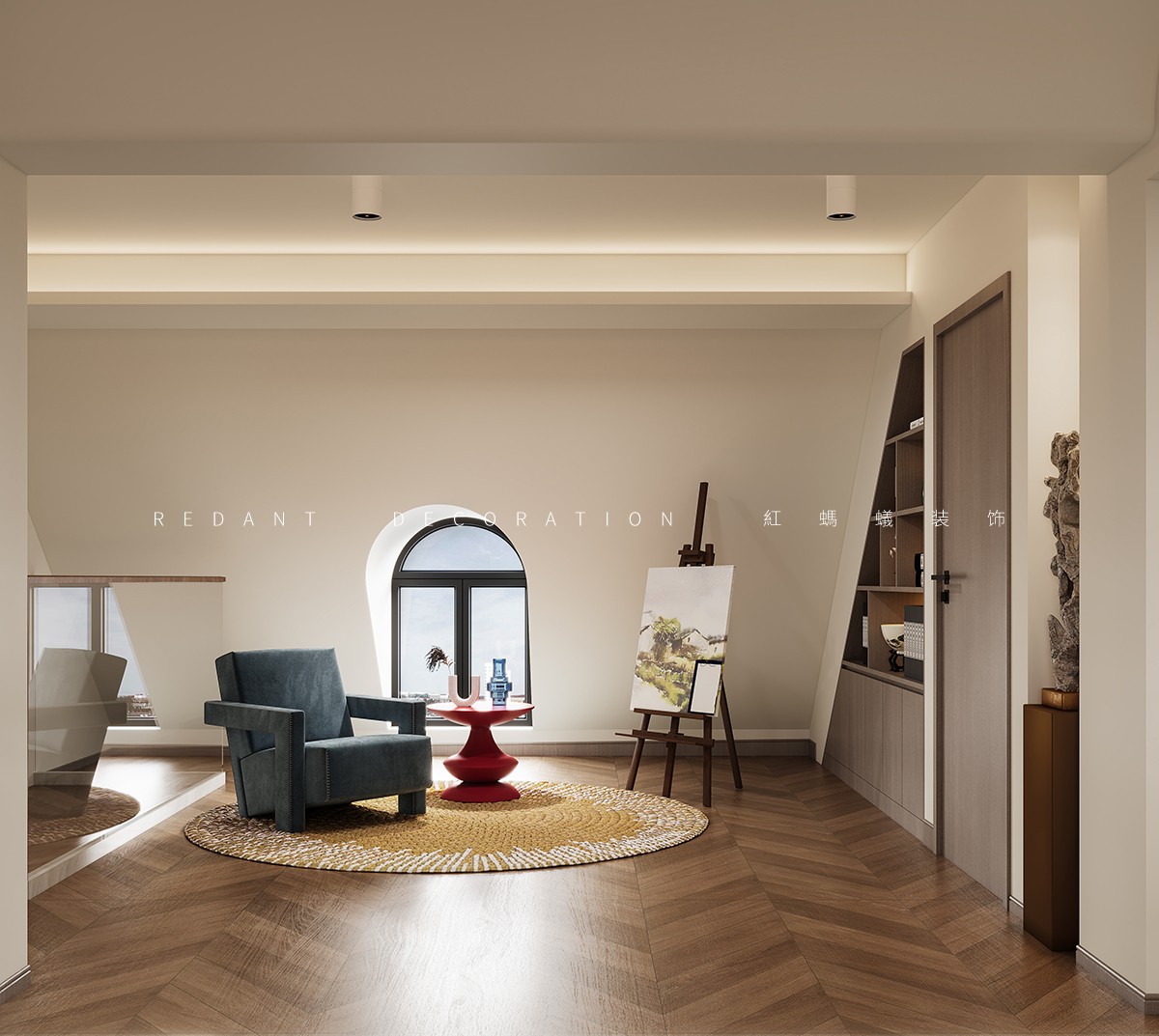 下层公共区以暖米白为基底,搭配石膏线、拱形门洞与复古吊灯,营造优雅浪漫的法式氛围;客餐厅开放式联动,木质家具与艺术挂画点缀,柔化空间质感。上层则转向新中式,利用斜顶优势打造茶室与画室,温润木饰面、格栅柜体与禅意摆件呼应,胭脂红艺术墙与蓝色单人椅形成撞色亮点,平衡传统与现代。