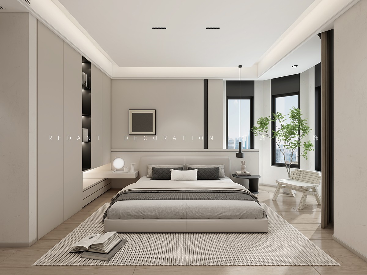 本方案以现代主义为核心,以浅米白、深炭灰的色彩对比,搭配微水泥、木饰面等材质,打造兼具秩序感与温度感的居住空间。餐厨区以深炭灰橱柜配白色台面,红色吊灯作焦点,长虹玻璃移门实现空间互动;客厅以浅米色沙发为核心,深绿大理石茶几、艺术挂画营造松弛高级氛围;卧室以一体化背景墙、通顶柜优化空间,浅灰床品、原木地板弱化冷感,全景窗引入城市景观。设计以动线、质感、功能为核心,融合秩序美学与松弛舒适,提升居住品质。