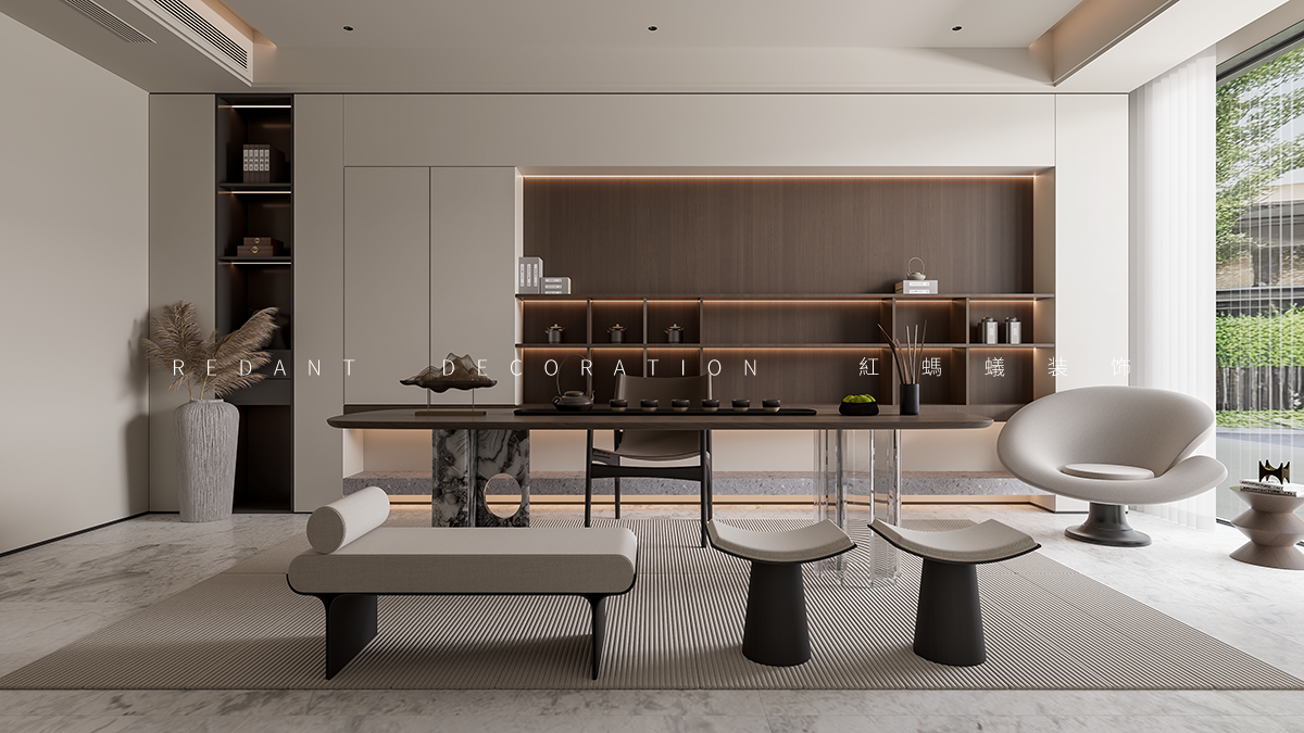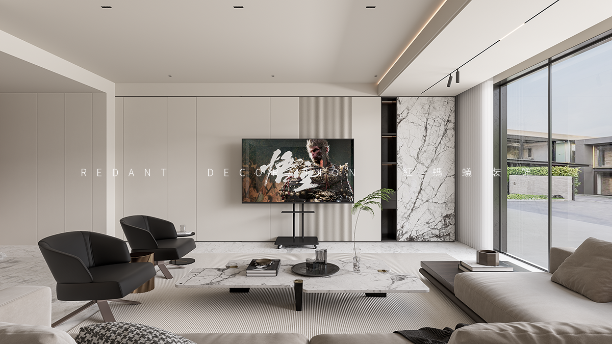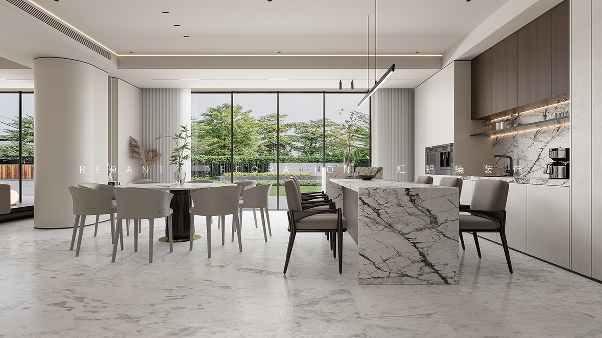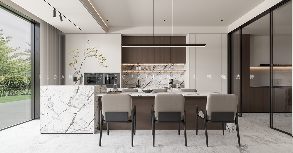 色彩与材质:以米白、深棕为主色调,搭配大理石、木质等天然材质,呈现简洁纯粹又不失质感的视觉效果。大理石的冷硬与木材的温润互补,营造平衡、舒适的氛围。