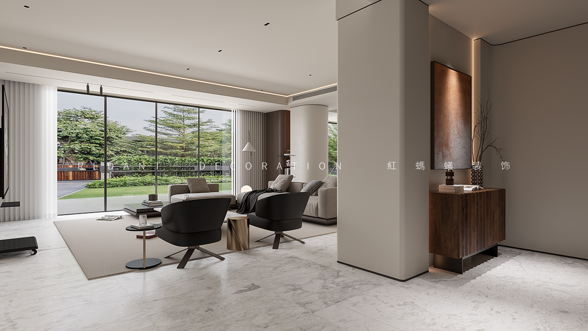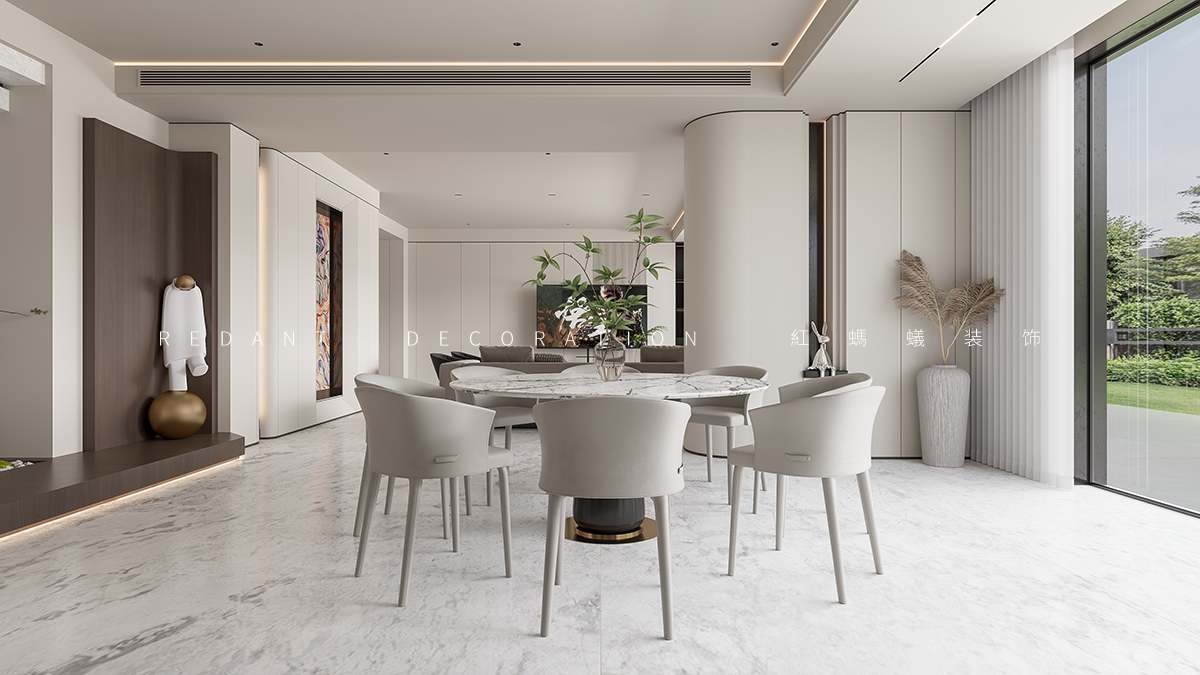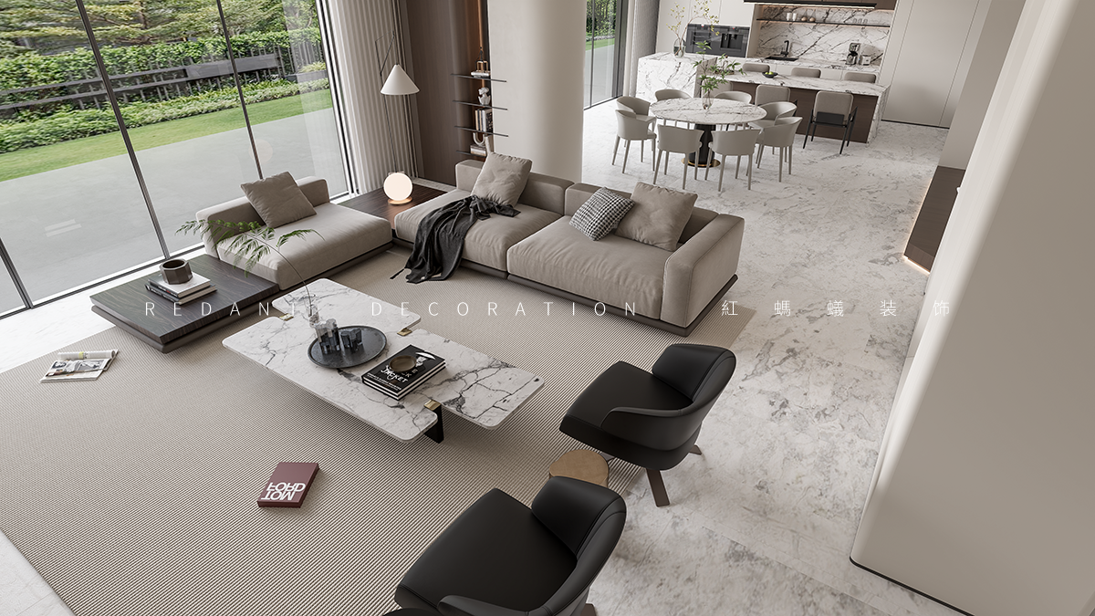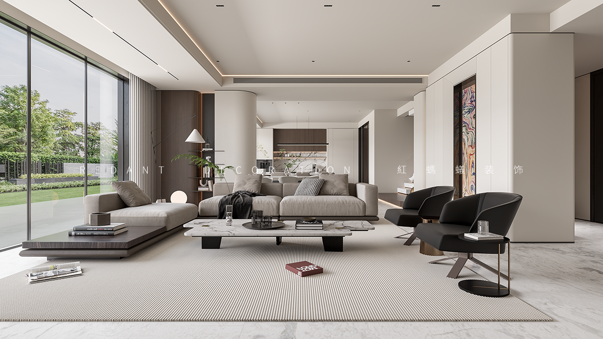空间布局:开放式格局串联客厅、餐厅,模糊功能边界,促进互动交流。大面积落地窗引入充足自然光线,借景室外绿植,实现室内外空间交融,延伸视觉层次。