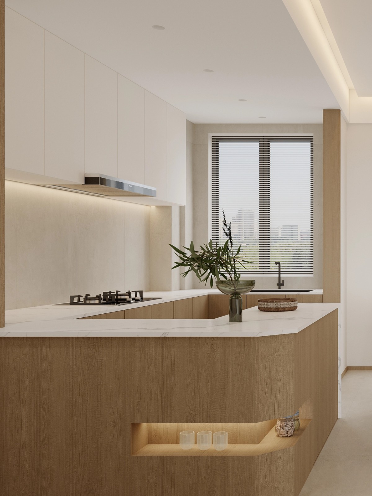 原木与白色的搭配清新雅致,中岛台兼具备餐与社交功能,大窗引入充足光线,让下厨成为一种享受,烟火气与设计感在此和谐共生。