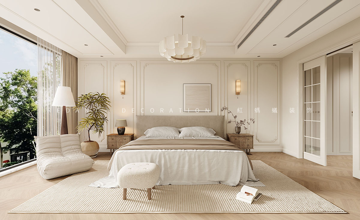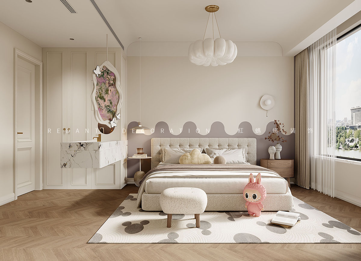 本项目以“温润松弛・通透共生”为理念,打造现代奶油风空间,以奶油白、浅杏色为基底,搭配浅原木、石材与香槟金点缀,弱化甜腻感。一层LDK一体化布局,螺旋楼梯为视觉核心,全屋通铺人字拼木地板,配模块化沙发、石质茶几,落地窗打通室内外;二层私密休憩区延续基调,主卧护墙板加石膏线条勾勒质感,分层照明配软包床头、亚麻床品,角落设懒人沙发与绿植,平衡结构感与居住温度。