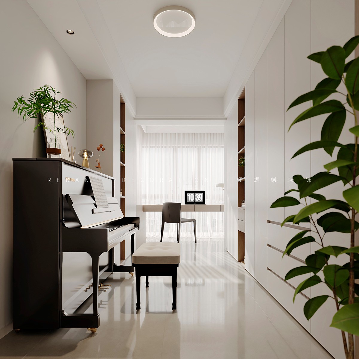 客厅保持开放视野,增强空间通透感;书房集多功能于一体,书柜结合墨菲床设计,既满足阅读需求,又为临时客房提供可能,大幅提升储物与空间利用率。主卧衣柜做窄处理,将主要收纳转移至书房,释放卧室休憩氛围。双阳台一分为二,部分并入书房,拓展室内活动区域。