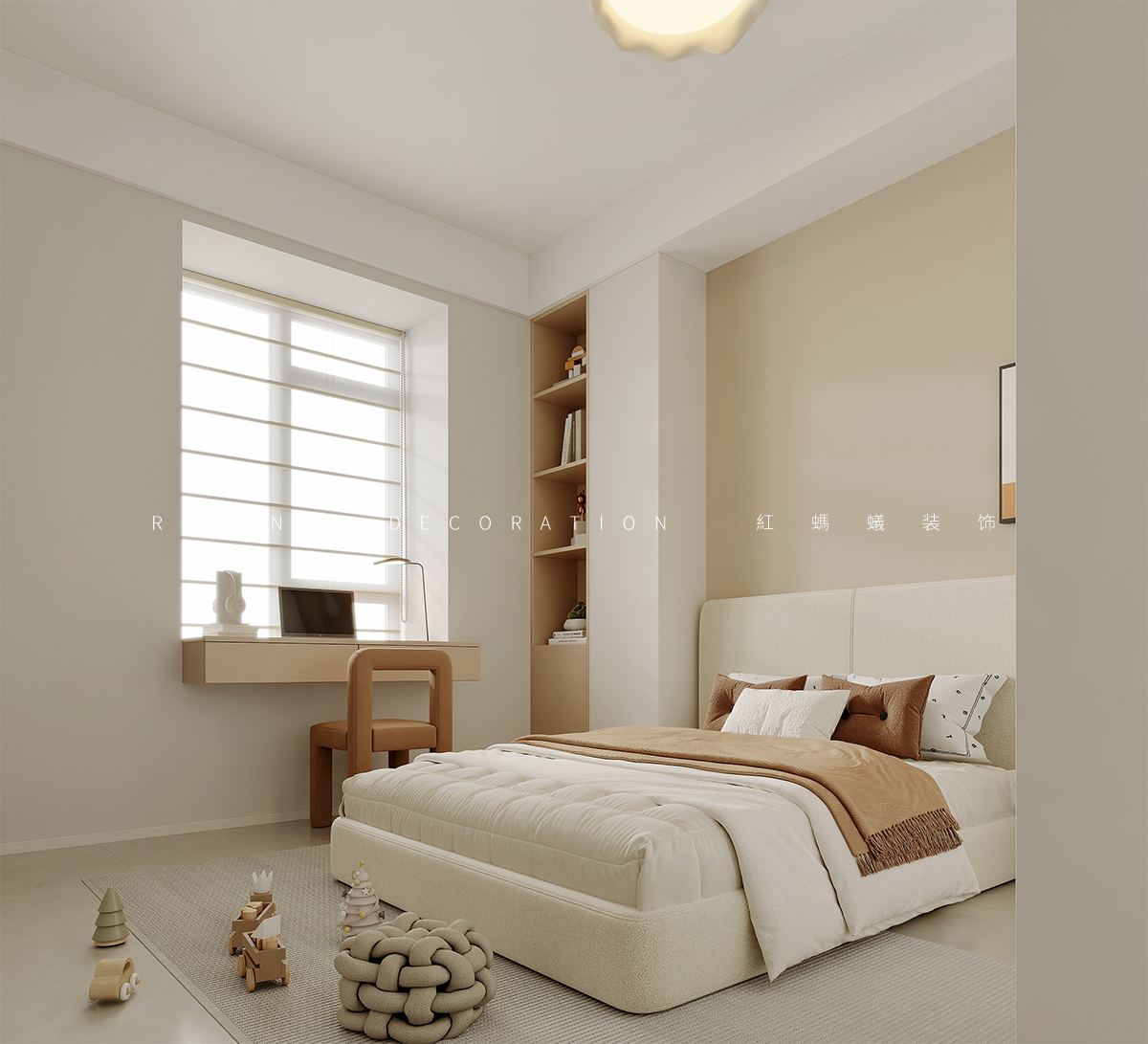 儿童房充分利用飘窗延展打造书桌,满足学习需求;床侧一体设计书柜与床头柜,衣柜按常规尺寸设置,确保收纳充足。生活阳台规划为家政区,定制洗衣机伴侣并增设储物高柜,顶部安装升降晾衣架,保持空间整洁有序。全案通过精细化布局,实现功能与美感的平衡,诠释现代简约生活的本质。